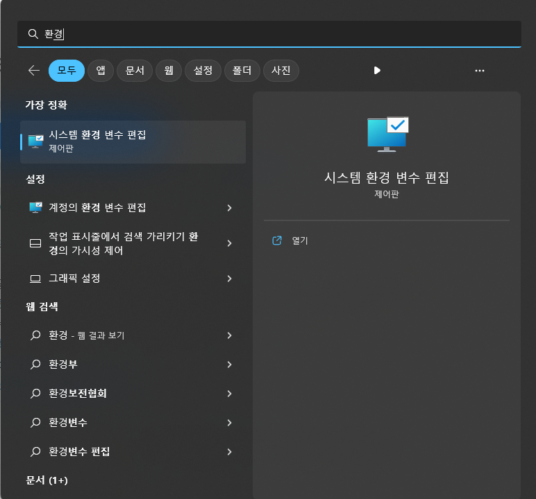 환경 변수는 우선 윈도우에서 환경 변수를 실행 해 줍니다.