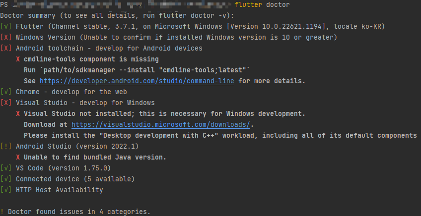Tip2. flutter doctor 실행 시 X나 !표가 체크된 부분은 구글링하면 해결방법이 나옵니다. 잘 보고 따라하시면 해결 가능해요.