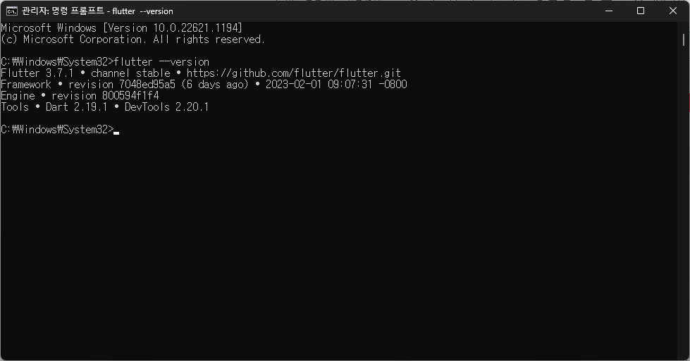 명령 프롬프트를 실행한 후, flutter --version을 실행해보면 정상적으로 세팅이 되었는지 확인 할 수 있습니다.