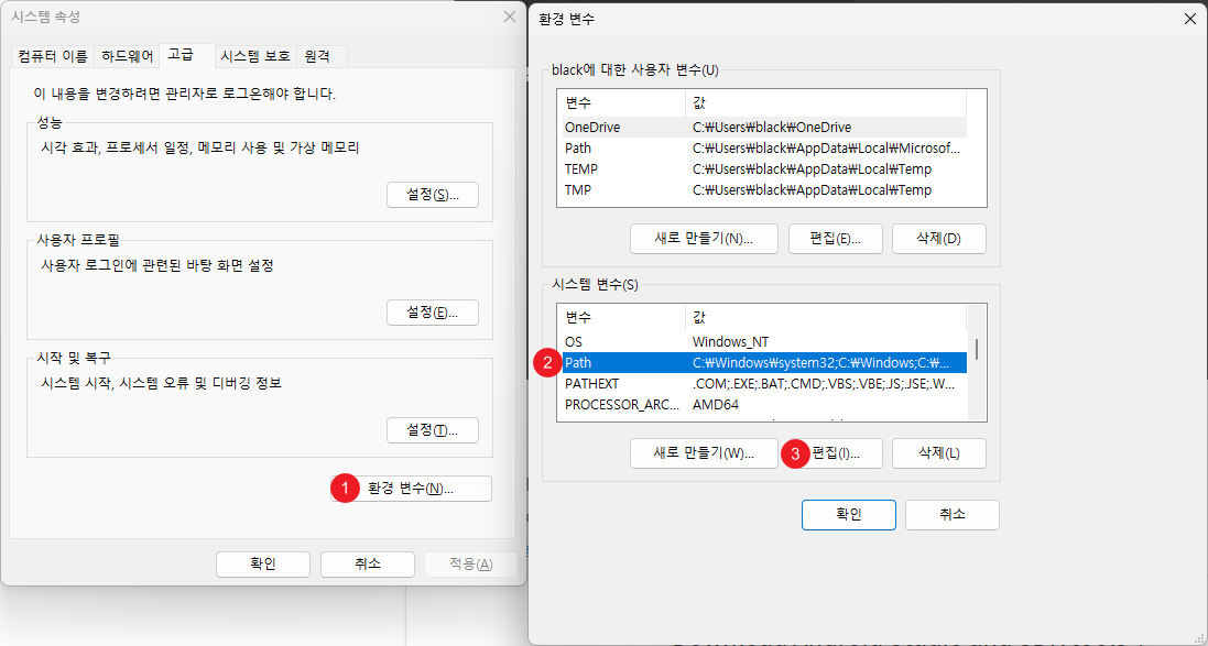 그후 시스템 속성 창에서 환경변수(1번)를 클릭한 후, 환경 변수 창의 시스템 변수에서 Path(2번)를 눌러주고 편집(3번)을 눌러 줍니다.