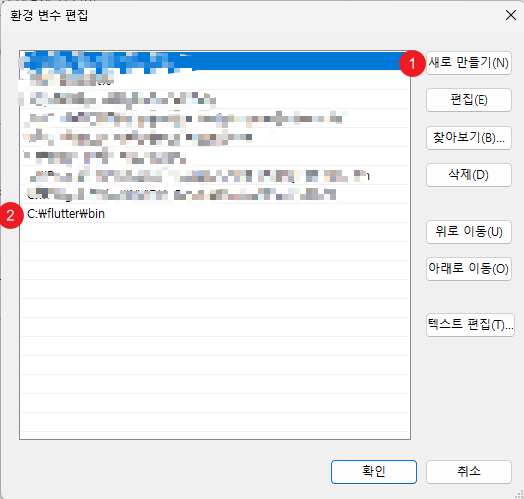 2. zip 파일 다운로드 후 압축 해제한 파일을 c:\flutter 에 옮겨주고 환경 변수에 c:\flutter\bin 을 Path에 입력해 줍니다. C:\flutter은 본인이 원하는 곳으로 해주면 됩니다. 공식 사이트에서는 C:\src\flutter로 되어 있네요.