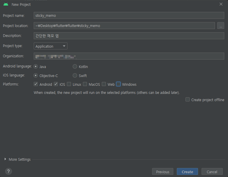 프로젝트 이름은 sticky_memo로 해주고 스마트폰으로만 출시 할것이기때문에 안드로이드와 ios를 선택해줍니다. 안드로이드 언어와 ios 언어는 기본적으로 kotlin과 swift로 선택되어 있는데 여기서는 건드리지 않을것이기때문 각 플랫폼의 기본 언어인 java와 objective-c로 변경해 주겠습니다.