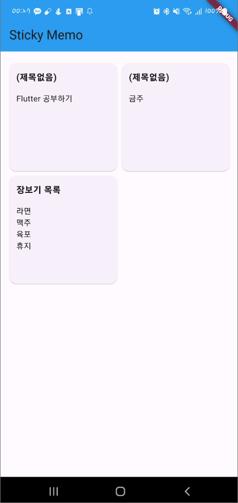 List<Note> notes = [ Note('Flutter 공부하기',color:Note.colorLime,), Note('금주',color:Note.colorBlue,), Note( ''' 라면 맥주 육포 휴지 ''', title: '장보기 목록', color: Note.colorRed, ), ];이제 화면을 확인해 보면 색이 바뀐것을 확인할 수 있습니다.